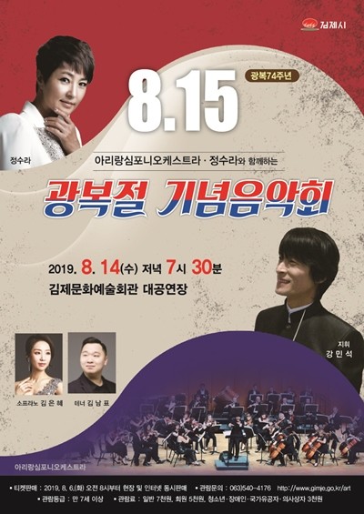김제문화예술회관에서 오는 14일 오후 7시 30분 광복 74주년을 기념하여 아 대한민국의 가수 정수라와 아리랑심포니오케스트라 음악감독 강민석의 지휘로 감동과 열정의 무대를 선보인다.