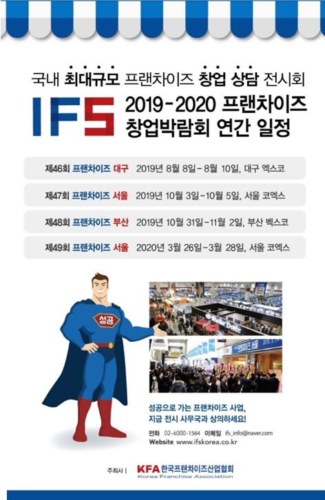 한국프랜차이즈산업협회가 예비 창업자들을 위해 프랜차이즈 관련 정보를 한 자리에 모아놓은‘2019 IFS 프랜차이즈 창업박람회’가 오는 8일부터 10일까지 3일간 대구 엑스코에서 열린다.